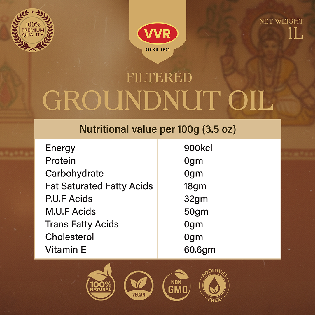 VVR Filtered Groundnut Oil is extracted from premium quality groundnuts using a traditional cold filtration method. It retains the oil’s natural aroma, flavour, and nutrients, making it a healthy and wholesome choice for everyday cooking and deep-frying.